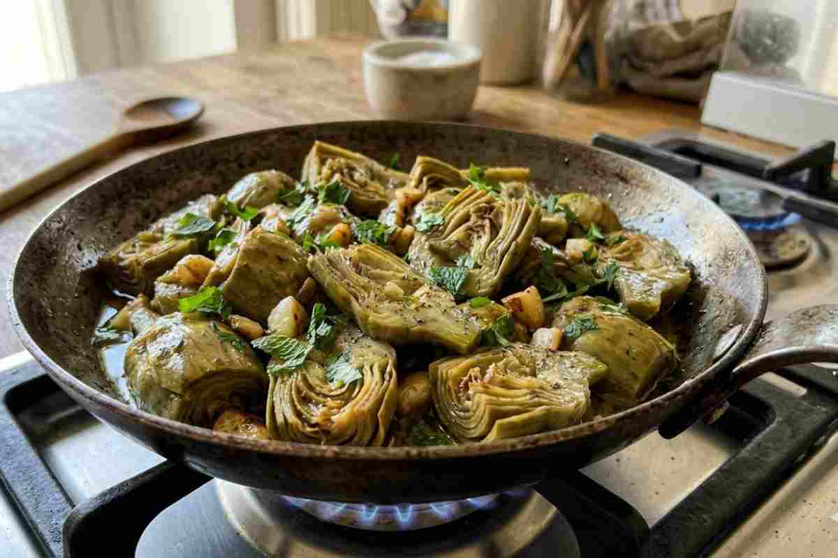 Il consiglio extra: se vuoi renderli un piatto unico, prova a rompere in questi carciofi in padella due uova sopra negli ultimi minuti di cottura e copri di nuovo finché l’albume non è cotto ma il tuorlo resta fondente. È la cena perfetta per quando fuori piove e hai bisogno di un abbraccio culinario
