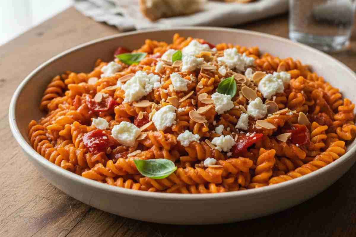 La ricetta dei Fusilloni con Crema di Peperoni Arrostiti, Feta e Mandorle Tostate – buttalapasta.it