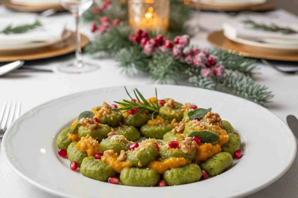 Gli gnocchi verdi con crema di zucca, noci e melograno sono il primo piatto da servire a Natale come alternativa ai soliti piatti, riusciranno a sorprendere in positivo tutti quanti.