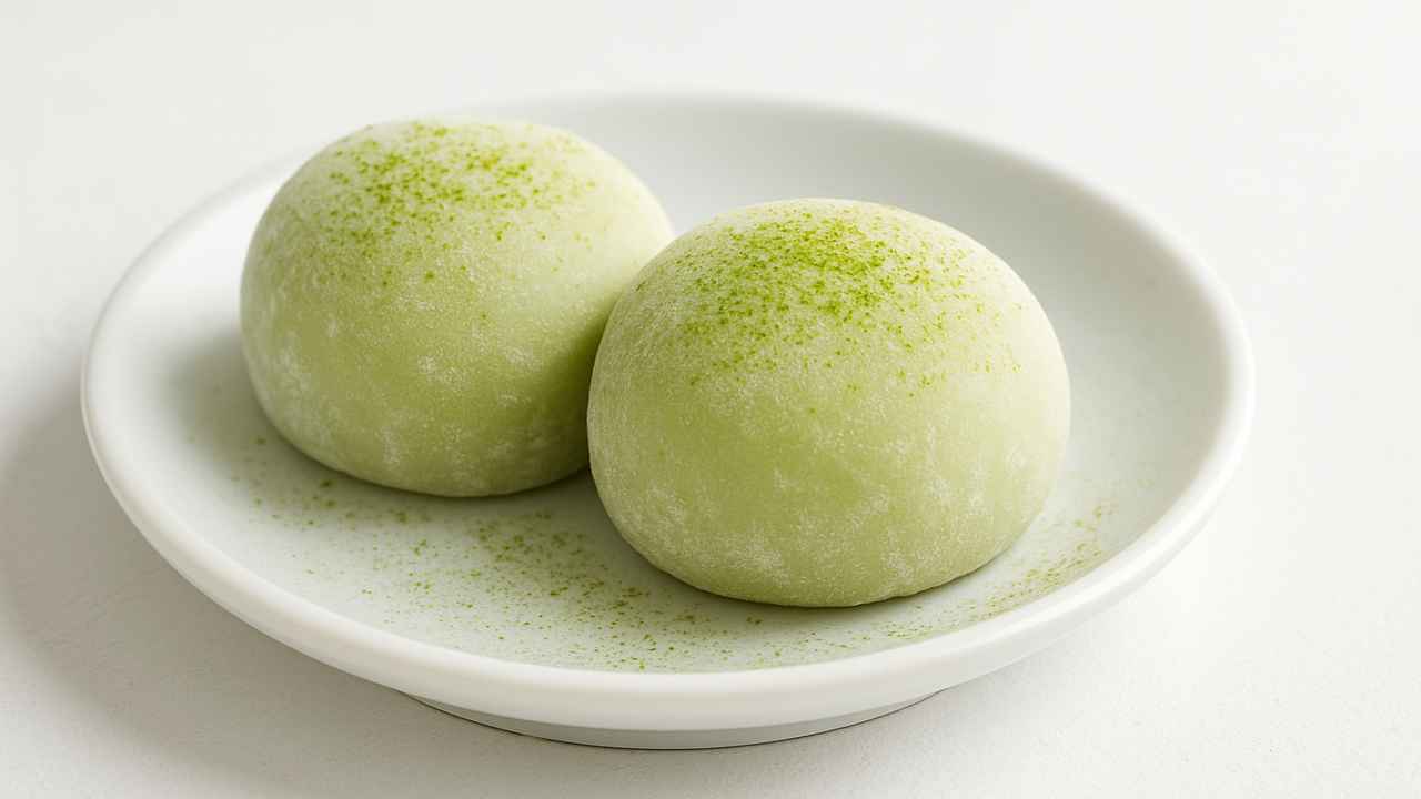 Riprendiamo quindi l’impasto cotto, stacchiamolo delicatamente con una spatola e incorporiamo il burro mentre è ancora caldo. Trasferiamolo su un piano di lavoro infarinato e lavoriamolo brevemente, poi dividiamolo in otto porzioni. Stendiamo ciascuna parte con un mattarello, farciamola con un cucchiaino di panna montata al matcha e richiudiamo bene, formando delle piccole palline lisce e sigillate.