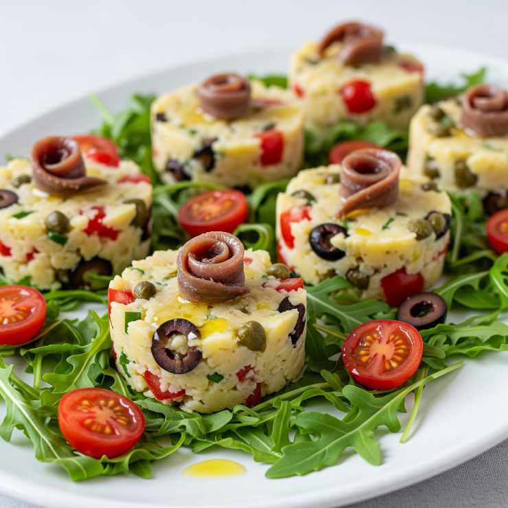- Schiacciamo verso il basso e facciamo riposare qualche ora in frigo: al momento di servire impiattiamoli su un vassoio con rucola o lattuga, un filetto di acciuga arrotolato su ogni tortino e infine un giro di olio a crudo. Voilà, tortini di patate senza cottura pronti da gustare!