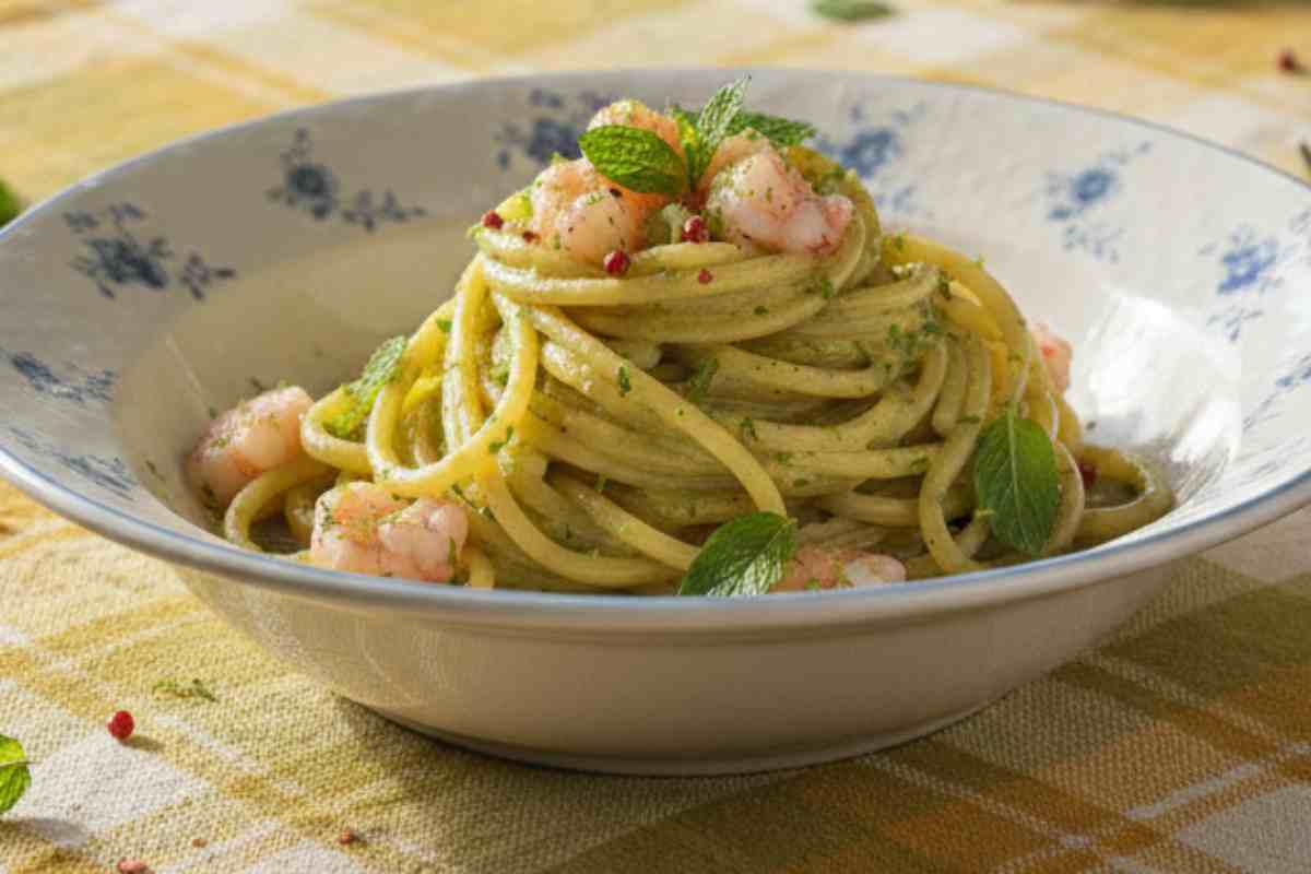 Quando vai a fare la spesa, compra degli spaghetti di Gragnano – i migliori in assoluto – e dei gamberi surgelati. Ti serviranno pure del formaggio di capra fresco, qualche lime, del pepe rosa, olio extravergine d’oliva ed un po’ di menta. Oltre al sale.