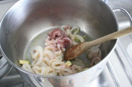 Pulite, lavate e tagliate ad anelli i totani o calamari o seppie che userete, nelle foto noi abbiamo usato 2 totani piccoli, e fateli rosolare nel tegame con l’aglio.